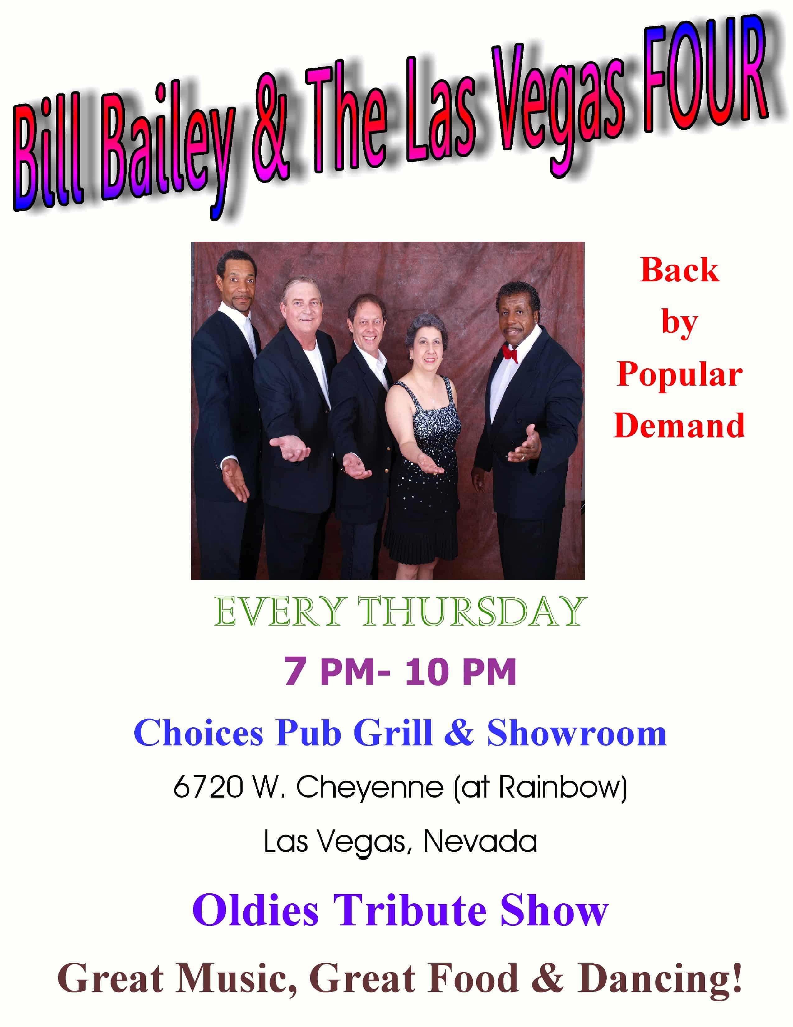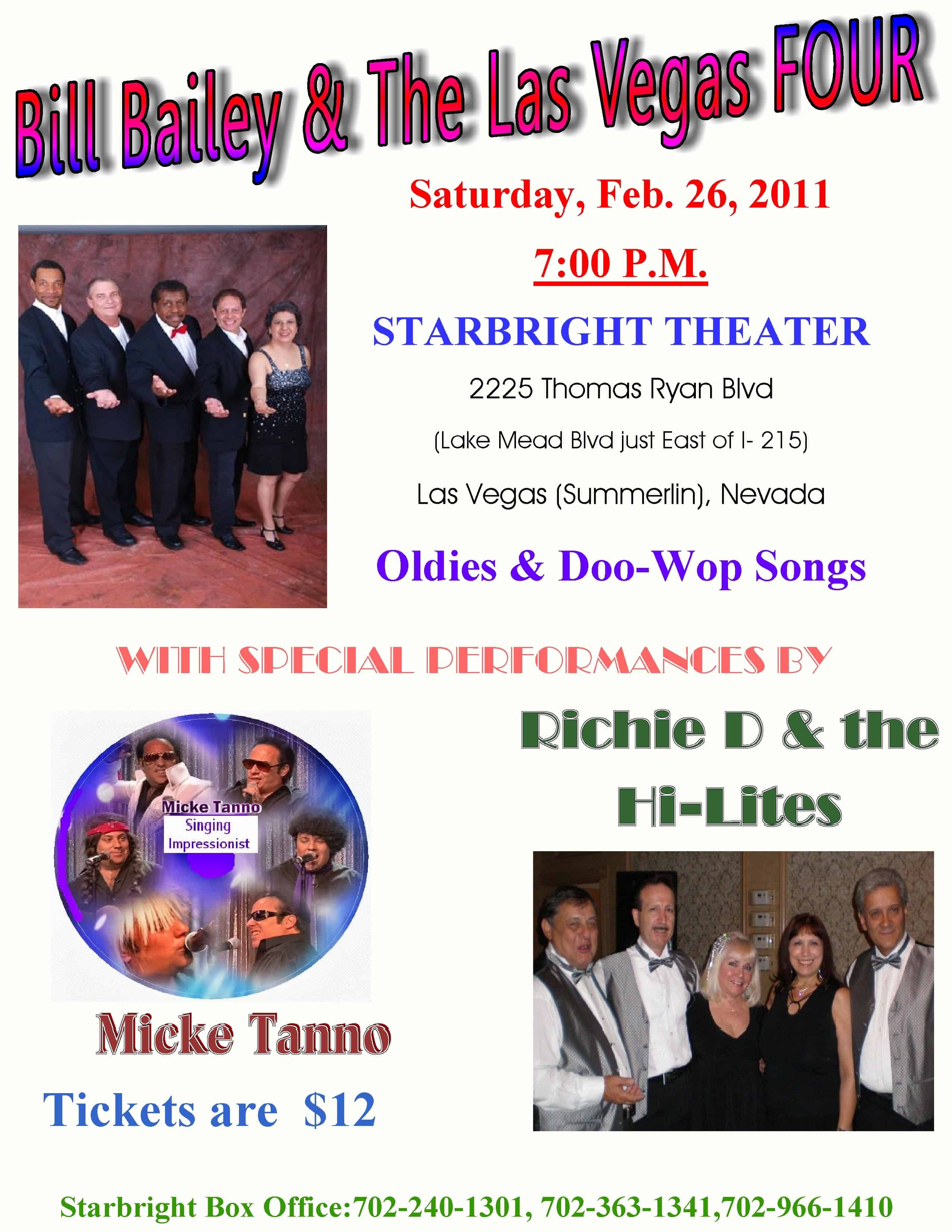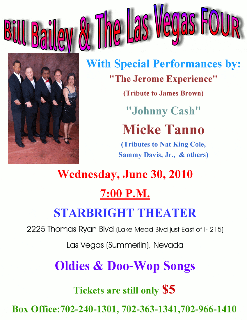 BILL BAILEY AND HIS BAND, THE LV 4, WILL BE PERFOMING AN OLDIES AND DOO-WOP TRIBUTE SHOW AT THE STARBRIGHT THEATRE, SUN CITY, SUMMERLIN NV ON SATURDAY, NOVEMBER 7, 2009 AT 7 PM. THE EVENT WILL BE RECORDED AND SHOWN ON THE INTERNET AROUND THE WORD. TICKETS ARE ONLY $5. COME AND ENJOY THE MUSIC AND BRING BACK THOSE WONDERFUL MEMORIES. FOR INFO. CALL 702-363-1546 OR EMAIL muscles2003w@aol.com. |